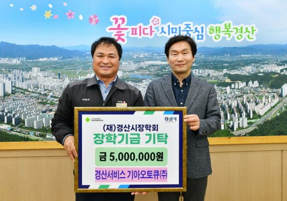 경산장학회에 지난 14일 경산서비스 기아오토큐㈜(대표 최의곤)가 장학금 500만 원을 기탁했다.