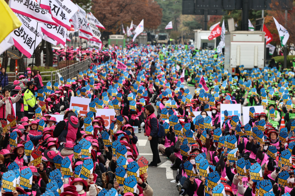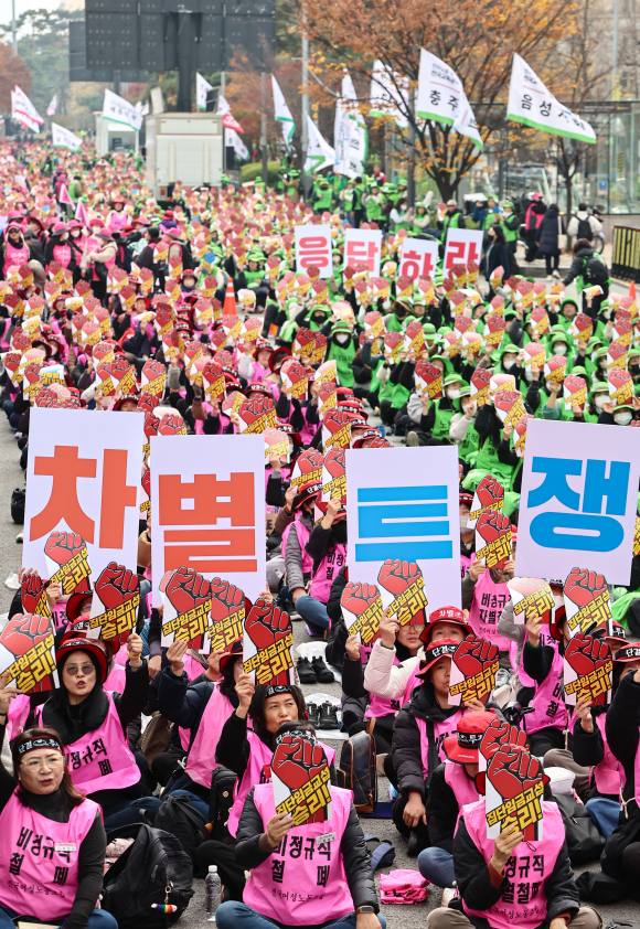 전국학교비정규직연대회의 활동가들이 20일 서울 영등포구 국회 앞 도로에서 열린 학교비정규직 노동자 1차 총파업 대회에서 비정규직 차별 철폐 등을 촉구하며 구호를 외치고 있다.뉴스1 |