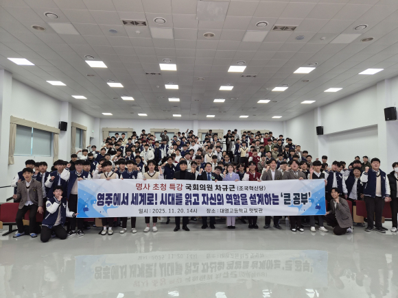 | 특별 진로 특강 모습.<대영고 제공> | 영주 대영고가 지난 20일 학교 시청각실에서 차규근 국회의원을 초청해 ‘영주에서 세계로! 시대를 읽고 자신의 역할을 설계하는 큰 공부’라는 주제로 특별 진로 특강을 실시했다.