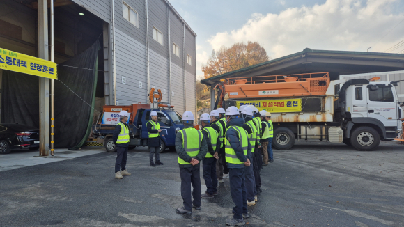 | 겨울철 제설작업 발대식이 진행되고 있다.<영주시 제공> | 영주시가 2025년 겨울철 강설 대응 역량을 강화하기 위해 제설작업 발대식과 실전 대비 훈련을 실시혔다. 지난 20일 진행된 훈련은 사전에 수립한 겨울철 도로 제설 대책이 실제 현장에서 원활히 작동하는지 확인하고, 강설 시 신속하게 대응할 수 있도록 현장 대응 체계를 점검하기 위해 마련됐다. 훈련에는 건설과 직원, 도로보수원, 임차기사 등 24명이 참여했다. 참여자들은 제설 매뉴얼 숙지, 호차별 제설 구간 확인, 시범 운행, 작업 전 안전교육 등 실제 제설 현장에서 필요한 절차 중심으로 실습을 진행했다. 참여자들은 제설 차량 가동 상태, 유류와 장비 점검, 자재 비축 현황 등을 꼼꼼히 확인했고, 노선별 시범운행을 통해 상습 결빙으로 인한 취약구간, 민원 다발 구역을 사전에 파악해 작업 우선순위와 장비 투입 계획을 구체화했다. 황규원 건설과장은 “제설은 시민 안전을 위한 것인 만큼 체계적이고 신속한 작업을 위해 앞으로도 주기적인 훈련과 교육을 철저히 시행하겠다”고 말했다. |