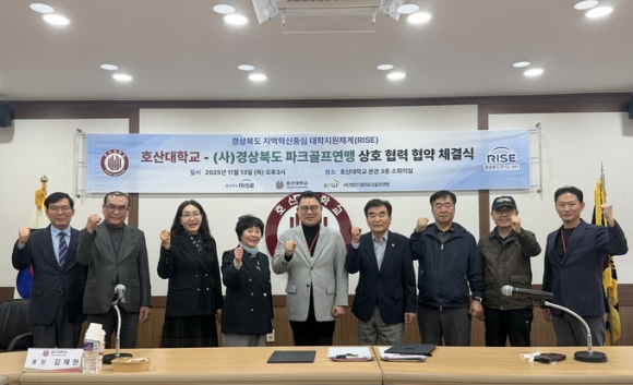 호산대가 고령화 사회 대응 및 지역 생활체육 활성화를 위해 (사)경상북도 파크골프연맹(회장 허돈억)과 상호협력 업무 협약을 체결했다. 협약은 경북도 지역혁신중심 대학지원체계(RISE)사업 단위과제 중 하나인 ‘대학평생직업교육체제 구축’의 일환으로 지난 13일 진행됐으며, 파크골프 분야의 전문 인력 양성과 교육·연구 활성화를 목표로 한다.