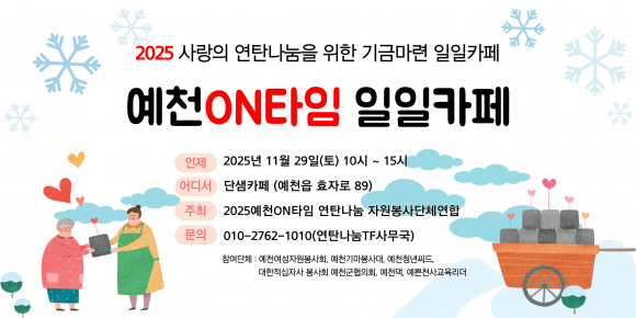예천ON타임 연탄나눔 자원봉사연합가 오는 29일 예천읍 소재 단샘카페에서 연말 취약 계층에게 전할 연탄 기부금을 마련하기 위해 ‘일일카페’를 운영한다.