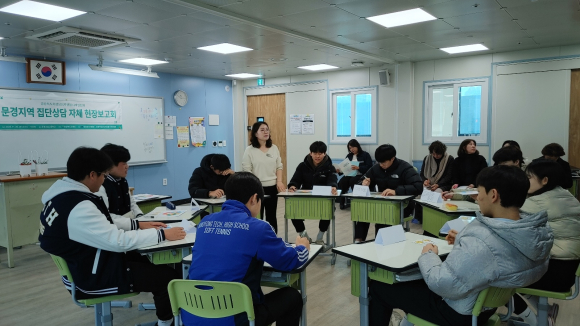 | 학생상담자원봉사자 집단상담 현장 보고회 개최 모습.<문경교육지원청 제공> | 문경교육지원청Wee센터가 지난 26일 오전 9시 50분 문경공고 1학년생을 대상으로 학생상담자원봉사자 집단상담 자체 현장보고회를 개최했다.