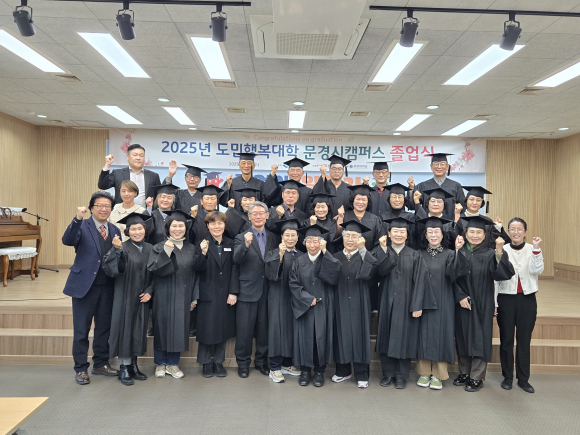 | 경북도민행복대학 문경시캠퍼스 명예학사학위수여식 단체사진=문경시제공 | 문경시가 지난 26일 문경시 평생학습관 대회의실에서 졸업생 등 40여 명이 참석한 가운데 ‘2025년 제5기 경북도민행복대학 문경시캠퍼스 명예학사과정 학위 수여식’을 가졌다.