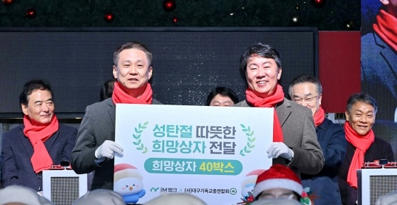 iM뱅크(은행장 황병우)가 지난 29일 동성로에서 열린 '2025 성탄트리 문화행사'에서 ㈔대구기독교총연합회가 추진하는 '따뜻한 희망상자 캠페인'에 동참했다.
