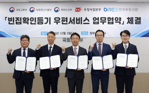 국토교통부가 3일 정부세종청사에서 농림축산식품부, 해양수산부, 과학기술정보통신부 우정사업본부, 한국부동산원과 함께 ‘빈집 확인등기 우편서비스’ 업무협약을 체결하고, 경기 광주와 경북 김천 등에서 시범사업을 실시한다.