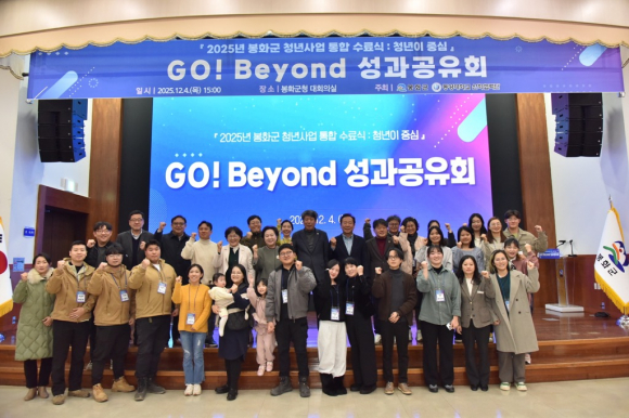 봉화군이 4일 군청 대회의실에서 '2025년 봉화군 청년지원사업 통합수료식:청년이 중심–Go! Beyond 성과공유회'를 개최했다. 행사에는 청년 창업가, 로컬크리에이터, 청년활동가와 봉화군 관계자 및 지역 의원 등 50여 명이 참석해, 한 해 동안 다양한 성과를 공유하고 내년도 비전을 함께 선포하는 시간을 가졌다.