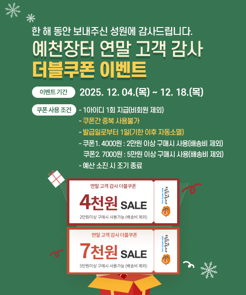 한 해 동안 ‘예천장터’를 이용하며 애정을 보내준 고객에게 감사의 마음을 전하기 위해 기획된 연말 특별 이벤트로, 기존 회원에게 구매 금액에 따라 ▲5만 원 이상 구매 시 7000원 할인쿠폰 ▲2만 원 이상 구매 시 4000원 할인쿠폰을 사용할 수 있다.