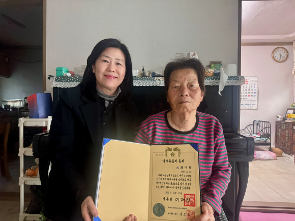 | 경북남부보훈지청이 10일 포항 남구에 거주하는 무공수훈자 배우자 민 모씨(88세)의 자택을 방문해 대통령 명의 국가유공자 증서를 전수했다.