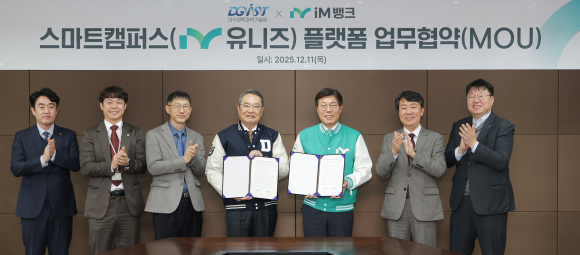 | ↑↑ iM뱅크가 DGIST와 스마트캠퍼스 유니즈 플랫폼 업무협약을 체결하고 기념촬영을 하고 있다. iM뱅크 제공 |