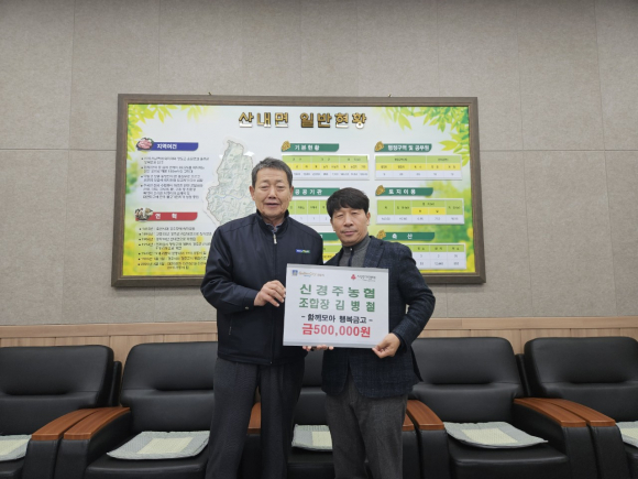 경주 신경주농협이 지난 11일, 지역 내 소외계층을 위해 사용해 달라며 성금 50만 원을 산내면‘함께모아 행복금고’에 기탁했다.