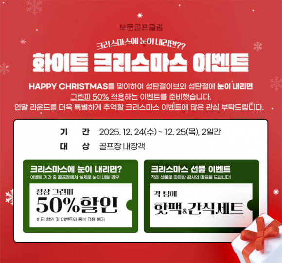 | 경북문화관광공사(이하 공사)가 보문골프클럽과 안동레이크골프클럽에서 오는 24일~25일까지, 내장 고객을 위한 특별 행사인 ‘2025 화이트 크리스마스 이벤트’를 개최한다.