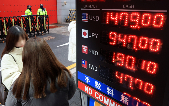 원·달러 환율 평균이 1470원을 넘어 외환위기 이후 월간 기준 최고 수준으로 치솟은 가운데 14일 서울 중구 명동 거리 환전소에 환율이 표시돼 있다.뉴스1 |