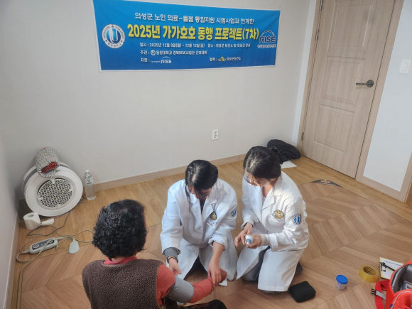 | 가가호호 동행 프로젝트 수행 모습.<동양대 제공> | 동양대 경북RISE사업단이 지난 8일~12일까지 2025년 가가호호 동행 프로젝트 7차 프로그램을 운영했다. 이번 활동은 의성군 노인 의료-돌봄 통합지원 시범사업과 연계하여, 지역 내 의료 접근성이 낮은 고령층을 대상으로 한 맞춤형 건강관리와 예방 중심의 보건교육을 중심으로 진행됐다. 이번 7차 프로그램에는 경북RISE사업단 파견인력 1명과 동양대 간호대학 3학년 학생 4명이 참여했다. 이들은 의료적 돌봄이 필요한 어르신 가정 4가구를 직접 방문해, 건강 상태를 점검하고 생활 습관에 따른 건강관리 방안을 함께 모색하였다. 특히 겨울철 건강 취약 요인을 고려해 낙상 예방, 체온 유지, 약물 복용 관리 등에 대한 실질적인 조언을 제공하며, 일상에서 실천할 수 있는 건강 습관 형성을 유도했다. 지난 11일 오후에는 안평면 박곡1리 경로당에서 지역 어르신들을 대상으로 '겨울철 낙상 안전'을 주제로 한 보건교육이 진행됐다.