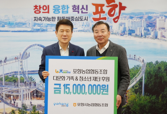 | 포항시가 16일 포항농업협동조합과 시청 대외협력실에서 취약계층 및 다문화가족, 교육소외 청소년의 안정적 정착과 자립 지원을 위한 후원금 1,500만 원 전달식을 가졌다.