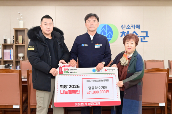 청송군에 18일 명궁약수가든(대표 윤난헌, 성주만)이 이웃돕기 성금 100만 원을 기탁했다. 윤난헌 대표는 누룽지백숙을 대표 메뉴로 운영하며 지역의 외식산업 발전에 기여하고 있고, 매년 인재육성과 이웃돕기 나눔실천에 동참하고 있다. 군 관계자는 “소외되고 있는 취약계층과 복지사각지대 발굴에 노력을 아끼지 않겠다”고 말했다. |