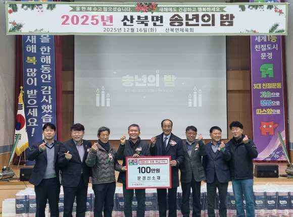 문경 산북면 행정복지센터가 지난 16일 열린 송년의 밤 행사에서 산북면 소재 기업체인 ㈜문경신소재(대표 김대겸)로부터 아름다운 동행 후원금 100만 원을, 바르게살기운동 산북면위원회(위원장 서홍도)에서 성금 70만 원을 각각 기탁받았다.