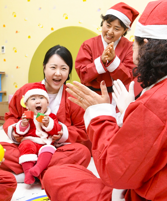 크리스마스를 일주일 앞둔 18일 경기 광주 능평도서관에서 산타 복장을 입은 엄마와 아기들이 놀이를 하고 있다.<공동취재, 뉴스1>