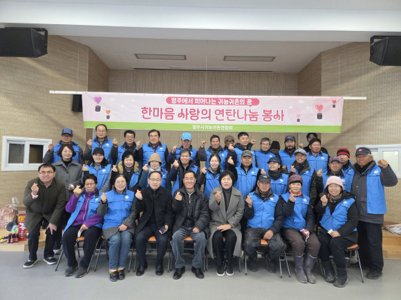 | 재능기부 봉사활동 단체 사진.<영주시 제공> | 영주 귀농귀촌연합회(회장 이철희)가 19일 회원 40여 명이 참여한 가운데 독거노인과 저소득 소외계층을 대상으로 ‘사랑의 연탄배달’ 봉사활동을 펼쳤다.