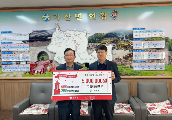 칠곡 가산 ㈜참품한우가 지난 30일 ‘희망2026나눔캠페인’ 이웃돕기 성금 모금에 동참하여 성금 500만 원을 기탁했다.