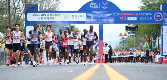 | ↑↑ 지난해 10월 경주시 보문관광단지 일원에서 열린 경주국제마라톤대회에서 국내외 엘리트 선수들이 힘차게 출발하고 있다.<경주시 제공> |