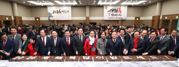 지난 2일 오후 대구 북구 EXCO에서 열린 '2026 국민의힘 대구·경북 신년인사회'에서 송언석 원내대표를 비롯한 참석자들이 새해 만복을 기원하며 떡케이크를 자르고 있다.뉴스1 |