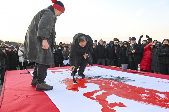 | 병오년 문경시 해맞이 행사-현장퍼포먼스 솟아오르는 붉은말-권정찬화백 작=문경시제공 |