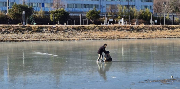 하천 얼음은 두께가 일정하지 않고 기온 변화에 따라 갑자기 깨질 수 있어 안전 사고로 이어질 가능성이 크다.