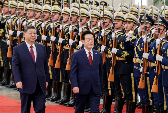 이재명 대통령과 시진핑 중국 국가주석이 지난 5일 베이징 인민대회당에서 열린 이 대통령 공식환영식에서 의장대를 사열하고 있다.뉴스1<관련기사 6면>