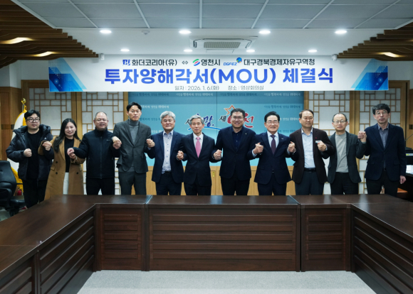 영천시가 6일 시청 영상회의실에서 화더코리아(유)와 1,000만 달러 규모의 투자유치를 위한 양해각서(MOU)를 체결했다.