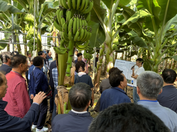 | ↑↑ 지난 2024년 포항 아열대 농업 기술을 벤치마킹하기 위해 타 지자체 농업인 단체가 포항 바나나 농장을 견학하고 있다.<포항시 제공> |