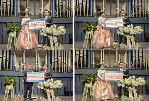 | ↑↑ 시계방향 재대구영천향우회, 남티롤 사과농장, 정각리 별빛마을부녀회, 정각초등학교 총동창회에서 장학금 기탁식 후 기념촬영을 하고 있다.<영천시 제공> |