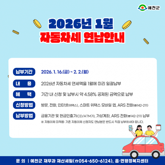 예천군은 ‘자동차세 연납 제도’를 오는 2월 2일까지 운영한다.