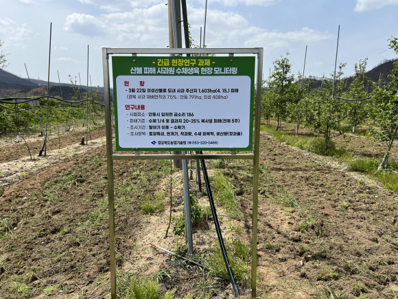 | ↑↑ 산불 피해 사과원 수체생육 현장 모니터링 과제.<경북도 제공> |