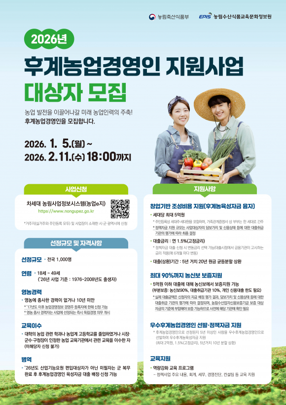 | 대상자 모집 안내 포스터.<영주시 제공> | 영주시가 지역 농업의 고령화와 인력 감소에 대응하고, 안정적 농업 경영 기반을 갖춘 전문 농업인을 육성하기 위해 ‘2026년 후계농업경영인 육성사업’ 대상자를 모집한다. 사업은 농업에 뜻을 둔 청년과 예비 농업인이 영농 초기 단계에서 겪는 자금 부담을 덜고, 안정적으로 농업에 정착할 수 있도록 지원하기 위해 마련됐다. 모집 대상은 사업 시행 연도 기준 18세 이상~49세 이하(1976년생부터 2008년생까지)의 예비 농업인과 영농 경력 10년 미만 농업경영인이다. 신청자는 실거주지와 주민등록상 주소지, 사업장이 모두 영주에 있어야 한다. 선정된 후계농업경영인에게는 농지와 축사 부지의 구입·임차를 비롯해 시설 설치, 종묘·사료 구입, 농기계 마련 등에 필요한 자금을 최대 5억 원까지 지원한다. 지원 자금은 연리 1.5%의 정책자금으로, 5년 거치 후 20년 동안 분할 상환하는 조건이다. 신청은 오는 2월 11일 오후 6시까지 차세대 농림사업정보시스템인 ‘농업e지’를 통해 온라인으로 접수하면 되며, 사업 관련 세부 사항은 농업e지 누리집에서 확인할 수 있다. 영주시 관계자는 “사업을 통해 열정과 역량을 갖춘 농업 인재들이 안정적으로 농업에 정착하고, 지역 농업의 지속 가능한 발전을 이끌어 나가길 기대한다”며 “관심 있는 예비 농업인과 청년 농업인의 적극적 참여를 바란다”고 말했다. |