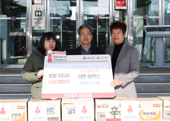 영양 금빛무도스쿨이 13일 군을 방문해, 원생과 함께 진행한 ‘사랑의 라면 모으기’활동으로 모은 라면 60박스를 기부했다.