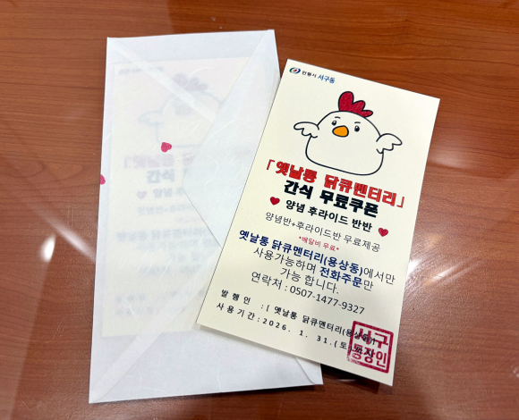 기부받은 치킨은 관내 한부모 가정에 전달될 예정이며, 서구동에서는 수혜 가정이 편리하게 이용할 수 있도록 전화 주문이 가능한 치킨 쿠폰을 제작해 배부했다.