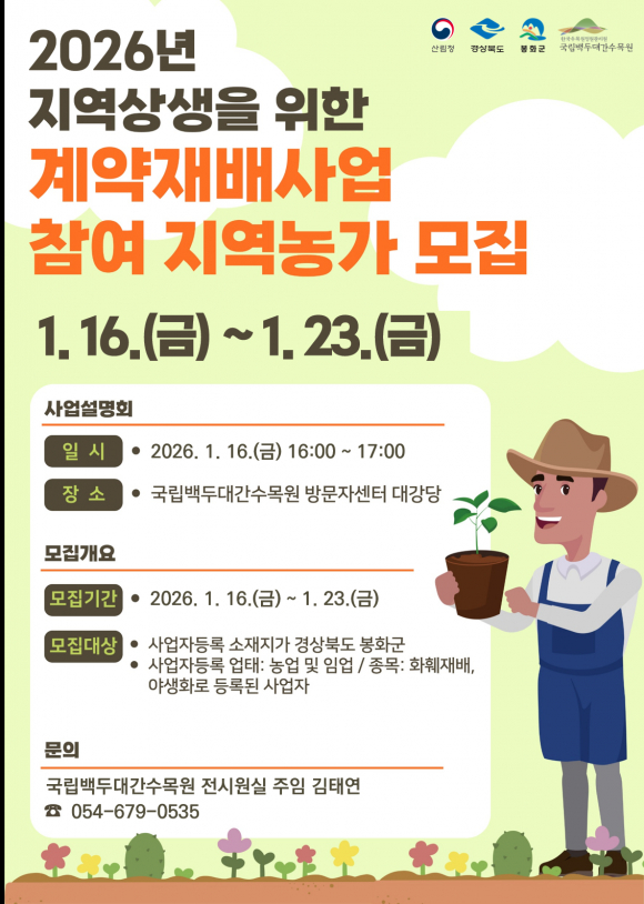 | 농가 모집 안내 포스터.<한수정 제공> | 산림청 산하 한국수목원정원관리원(이사장 심상택)이 ‘2026년 지역상생 계약재배사업’에 참여할 임·농가를 오는 16일~23일까지 모집한다. ‘지역상생 계약재배사업’은 수목원 조성·운영에 필요한 식물을 지역 임·농가를 통해 공급받는 지역상생사업으로, 계약재배, 일자리, 협력 전시로 지역 균형발전 및 상생발전을 선도하는 사업이다. 사업 참가 대상은 봉화에 소재하고 있는 화훼(야생화) 재배업 등록 농가이다. 신청 방법은 오는 23일까지 국립백두대간수목원 방문자센터 1층 안내 데스크를 방문해 신청서를 제출하면 된다. 이와 관련 국립백두대간수목원은 오는 16일 방문자센터 대강당에서 ‘2026년 지역상생 계약재배 사업설명회’를 개최할 예정이다. 설명회에는 ▲계약재배사업에 대한 취지와 배경 ▲지원 자격 ▲식물 재배 ▲납품 기준 등 사업의 전반적인 정보에 대해 공유할 예정이다. 기타 자세한 사항은 국립백두대간수목원 누리집(www.bdna.or.kr)에서 확인할 수 있다. 이규명 국립백두대간수목원장은 “사업설명회를 통해 청년 및 저소득·취약계층 등 다양한 이들의 많은 참여를 기대한다”며 “계약재배사업의 운영 안정화 및 지역 농가 생산기반 구축을 통해 지역사회와 국립백두대간수목원이 상생 발전하는데 기여하겠다”고 말했다. |