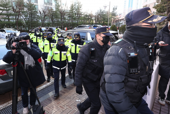 경찰이 공천헌금 수수 등 각종 비위 의혹에 휩싸인 김병기 더불어민주당 의원 주거지 등 6개소에 대한 압수수색에 나선 14일 서울 동작구 김병기 의원의 자택으로 경찰병력들이 투입되고 있다.관련기사 6면 <뉴스1>