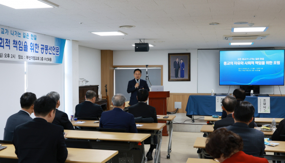 세계평화통일가정연합이 지난 11일 오후 2시, 부산가정교회 3층 수선화홀에서 ‘종교자유와 사회적 책임을 위한 포럼’을 개최됐다. 이날 포럼에는 기독교, 가정연합 등 다양한 종교계 인사와 시민들이 참석해 종교의 자유 보장과 사회적 책임 실천이라는 공통 과제를 놓고 연대 방안을 모색했다.