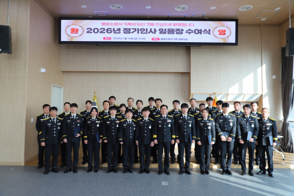 | 임용장 수여식 모습.<봉화소방 제공> | 봉화소방서가 지난 16일 본서 3층 대회의실에서 2026년 1월 소방공무원 전입·전보에 따른 임용장 수여식을 개최하고, 전입자 19명과 전보자 9명 등 28명에게 임용장을 수여했다. 행사는 김인식 소방서장의 임용장 수여를 시작으로 환영 인사, 기념 촬영 순으로 진행됐으며, 새로운 근무지에서 첫발을 내딛는 직원들을 격려하고 조직에 대한 소속감을 높이는 시간으로 마련됐다. 전입 및 전보된 직원은 개인별 업무 역량과 경력, 보유 자격 등을 종합 고려해 일선 119안전센터와 소방행정부서 등 부서에 배치됐으며, 앞으로 봉화 지역 각종 재난 대응과 군민 안전을 위한 역할을 수행하게 된다. 김인식 소방서장은 “봉화소방서 가족으로 함께하게 된 것을 진심으로 환영한다”며 “새로운 환경에서의 변화는 또 다른 성장의 기회인 만큼, 각자 자리에서 책임감 있게 맡은 역할을 수행하며 소방관으로서의 사명을 충실히 다해주길 바란다”고 말했다. |