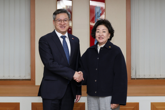 박윤경 대구상공회의소 회장(오른쪽)이 지난 16일 대구상공회의소에서 진일표 주부산중국총영사를 만나 지역 투자유치 협력방안 및 지역기업의 중국진출 방안에 대해 논의하고 악수하고 있다. |