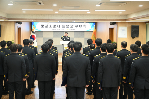 | 임용식 모습.<문경소방 제공> | 문경소방서가 지난16일 전입 및 승진․전보자 59명에 대해 2026년 상반기 정기 인사발령 임용식을 개최했다.