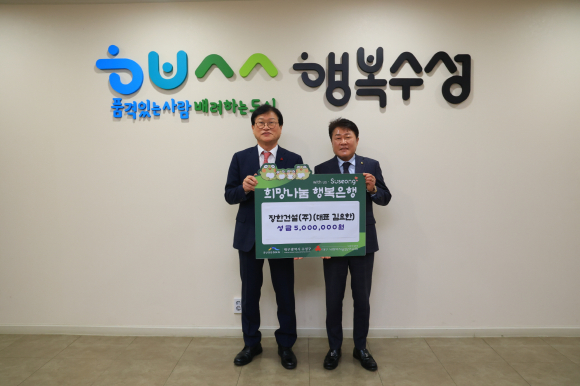 장한건설(주)이 지난 21일 수성구청을 방문해 구민이 행복한 한 해를 보내길 바라는 뜻을 담아 성금 500만 원을 기탁했다.