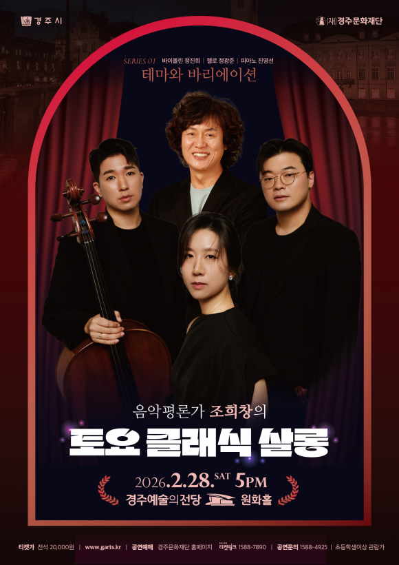 경주문화재단 관계자는 “'조희창의 토요 클래식 살롱'은 해설과 연주가 어우러진 공연으로, 클래식을 처음 접하는 관객도 부담 없이 즐길 수 있는 프로그램”이라며 “앞으로도 격월로 이어지는 공연을 통해 시민들과 꾸준히 만날 계획”이라고 밝혔다.