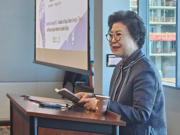 ↑↑ 남성희 대구보건대학 총장이 미국 AUS 서밋에서 초광역권 연합을 이룬 대구보건대, 대전보건대, 광주보건대로 구성된 '한달빛글로컬보건연합대학'을 소개하고 있다. 대구보건대 제공