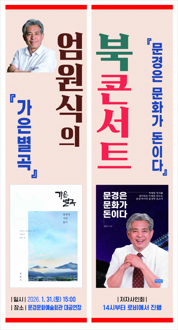 26년간 문경 문화 현장을 누비며 ‘걸어 다니는 문경 백과사전’으로 불려온 엄원식 전, 가은읍장이 공직 생활을 마무리하고, 오는 31일 오후 3시 문경문화예술회관 대공연장에서 아주 특별한 북콘서트를 개최한다.