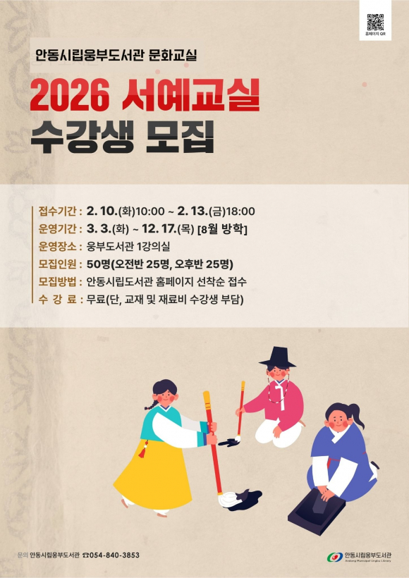 안동시립웅부도서관이 오는 2월 10일~13일까지 문화교실 ‘서예 강좌’ 신입회원을 모집한다.
