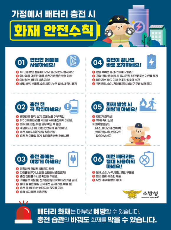 리튬이온 배터리는 충전 중 과열이나 손상, 부적절한 사용 환경으로 화재로 이어질 수 있어 주의가 필요하다. 이에 봉화소방서는 ▲정품 배터리·충전기 사용 ▲가연물 위 충전 금지 ▲통풍이 잘되는 장소에서 충전 ▲손상·변형된 배터리 사용 금지 ▲충전 완료 후 전원 차단 등 주요 안전수칙을 안내하고 있다.