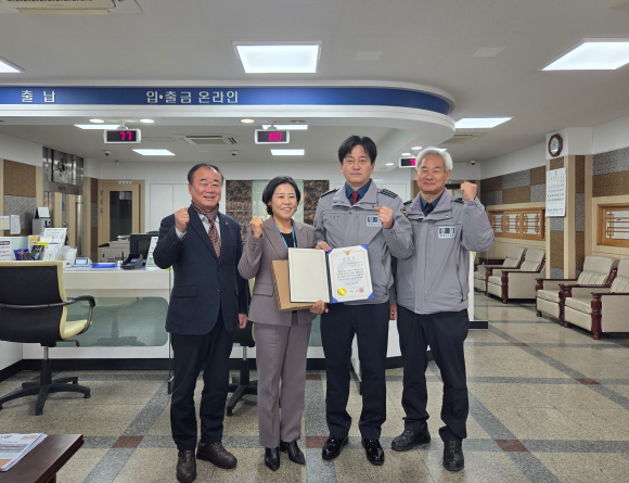 | 금융범죄 예방한 은행직원에 감사장을 수여하고 있다.<문경경찰서 제공> | 문경경찰서(서장 이규봉)에서가 지난 27일, 전화금융사기 범죄 피해를 예방한 문경제일새마을금고 문경점에 근무하는 A씨에게 감사장을 전달했다.